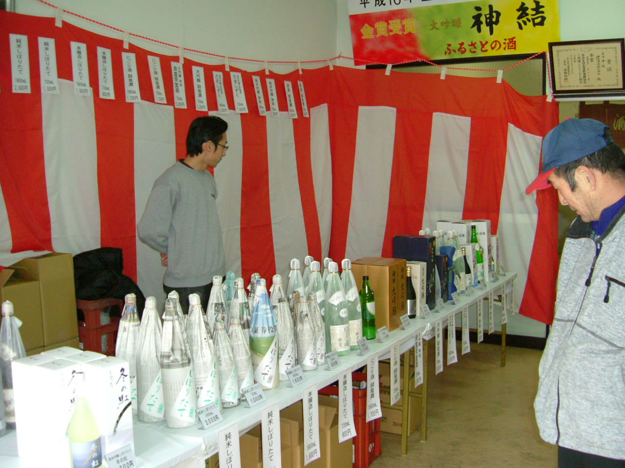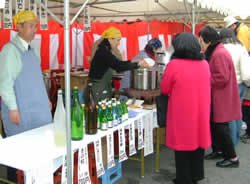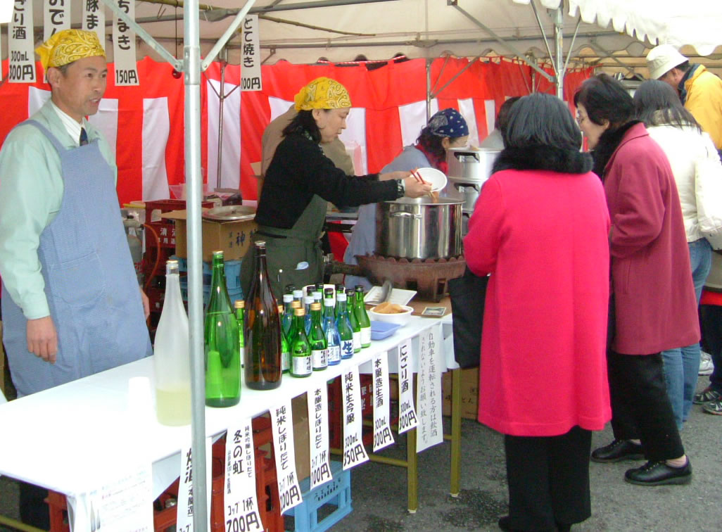 しぼりたてのお酒(純米吟醸・純米・本醸造)や燗酒、おでん、豚まん、ちまき、どて焼き等の販売風景です。