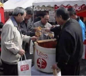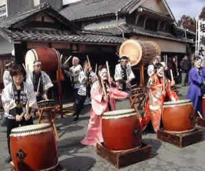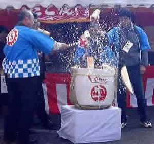 宴は鏡開き(右写真上)ではじまり、次に闘竜太鼓(右写真下)の力強い演奏が花を添えました。会場の中ではしぼりたての新酒とおでん・湯豆腐・甘酒を堪能していただきました。「きき酒コーナー」では甘辛当てと種類当てを行い、7問全問正解者には大吟醸が贈られました。また地酒や地元物産品(鮎もなかや木工品など)の販売、蔵見学を行いました.。